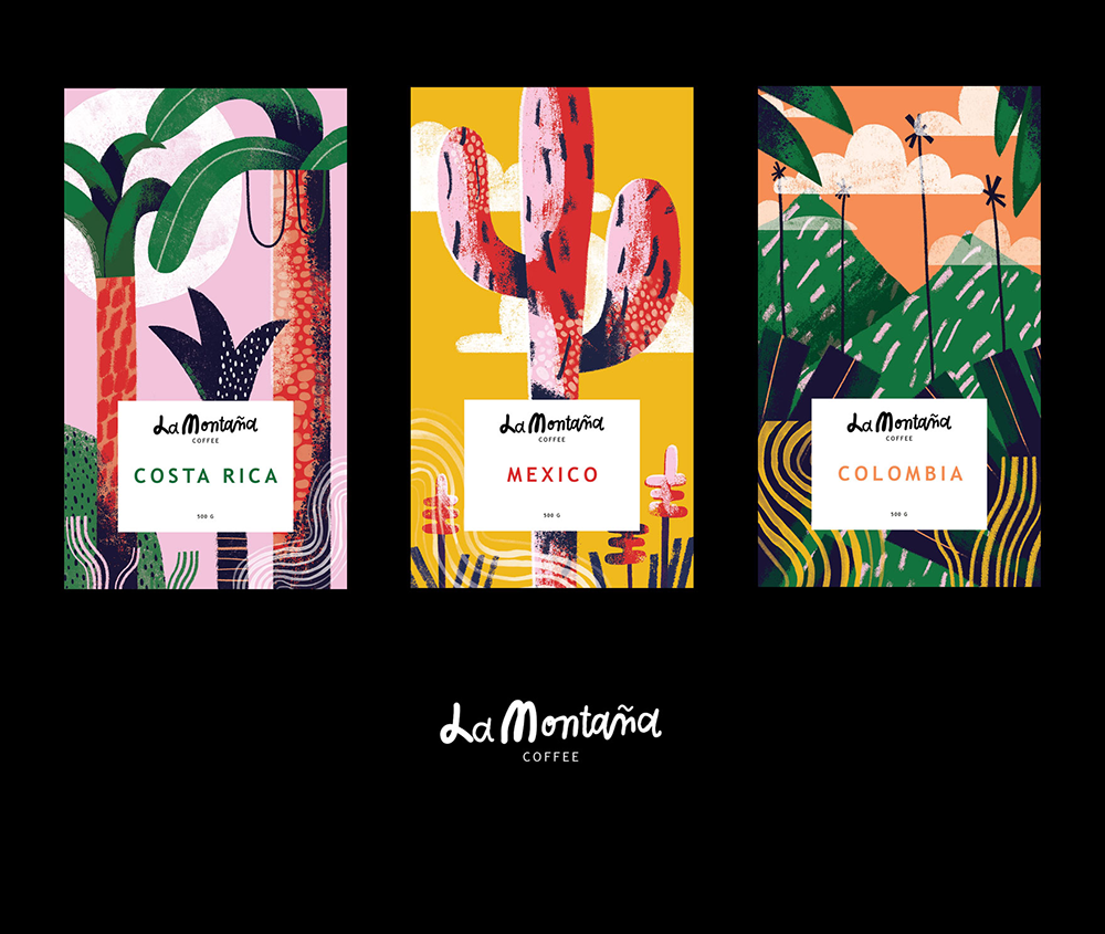 Coffee packaging design for a fictional brand La Montaña, and their selection of different origin coffees.